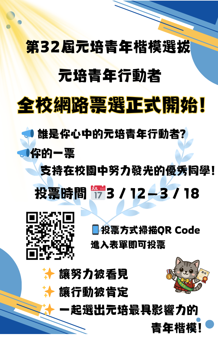 透過每一張選票,讓努力被看見、讓行動被肯定,一起選出代表元培精神的青年楷模吧!